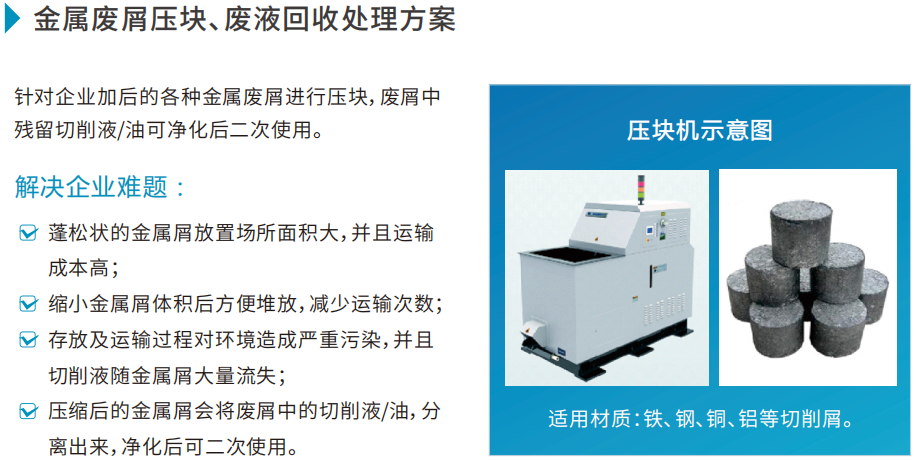 针对企业加后的各种金属废屑进行压块,废屑中残留切削液/油可净化后二次使用。